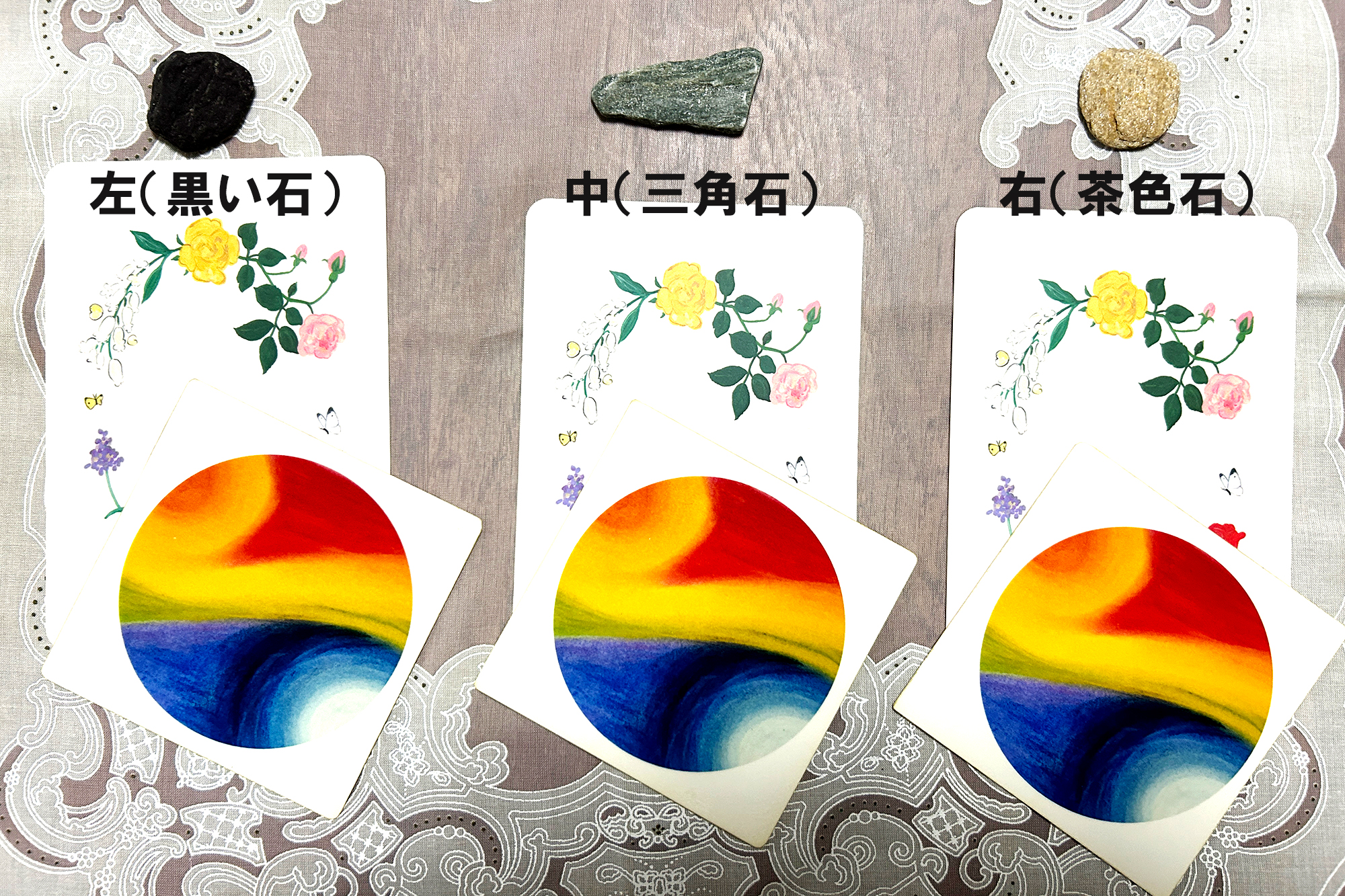 「左(黒い石)」「中(三角石)」「右(茶色石)」のうちから選んで頂き、